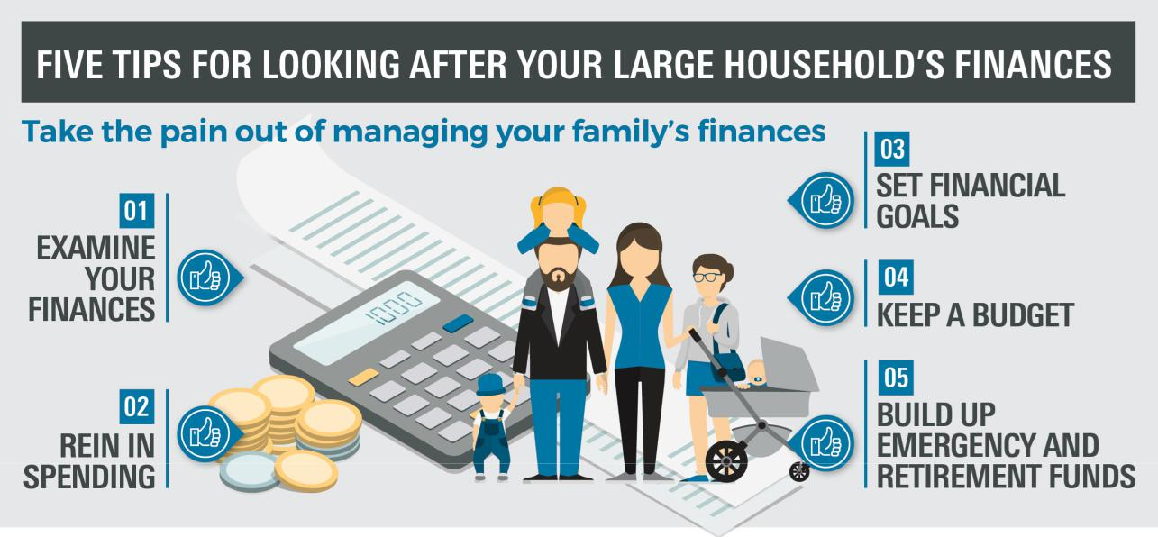 Managing finances for a big family need not be a painful exercise. By working alongside a financial adviser to keep track of your spending, and discussing money matters and setting financial goals as a family, handling household finances is a task you can achieve.
